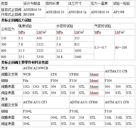 美標(biāo)止回閥又稱單向閥或逆止閥,其作用是防止管路中的介質(zhì)倒流。啟閉件靠介質(zhì)流動(dòng)和力量自行開啟或關(guān)閉,以防止介質(zhì)倒流的閥門叫止回閥。美標(biāo)止回閥屬于自動(dòng)閥類,主要用于介質(zhì)單向流動(dòng)的管道上,只允許介質(zhì)向一個(gè)方向流動(dòng),以防止發(fā)生事故。本類閥門在管道中一般應(yīng)當(dāng)水平安裝。美標(biāo)止回閥制造標(biāo)準(zhǔn):中國GB、機(jī)械部JB、化工標(biāo)準(zhǔn)HG、美標(biāo)API、ANSI、德標(biāo)DIN、日本JIS、JPI、英標(biāo)BS生產(chǎn)。閥體材質(zhì):銅、鑄鐵、鑄鋼、碳鋼、WCB、WC6、WC9、20#、25#、鍛鋼、A105、F11、F22、不銹鋼、304、304L、316、316L、鉻鉬鋼、低溫鋼、鈦合金鋼等。工作壓力1.0Mpa-50.0Mpa。工作溫度:-196℃-650℃。連接方式:內(nèi)螺紋、外螺紋、法蘭、焊接、對(duì)焊、承插焊、卡套、卡箍。驅(qū)動(dòng)方式:手動(dòng)、氣動(dòng)、液動(dòng)、電動(dòng)。